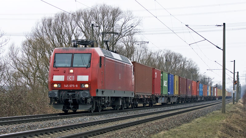 | Etliche Container brachte die 145 075-8 aus dem Hafen. Hamburg-Moorburg, 12. März 2010 |