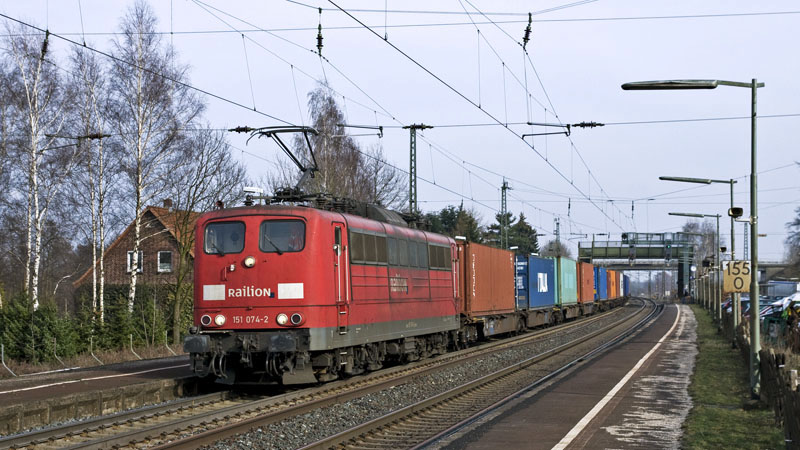 | Noch mehr Seekisten brachte die 151 074-2 nach Hamburg in den Hafen. Ashausen, 24. März 2010 |