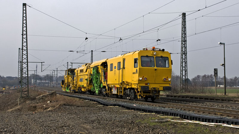 | Der JumboTec-Gleisbauzug von MATISA durchfuhr die künstlich angelegte "Wüste" von Ashausen. Ashausen, 24. März 2010 |