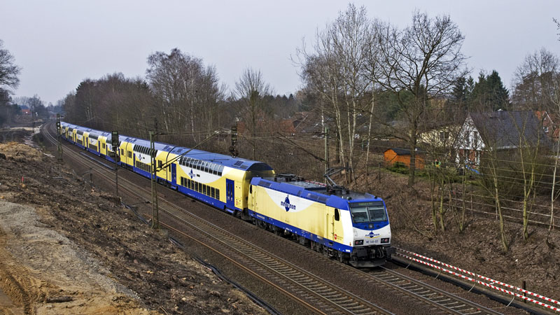 | Die ME 146-01 schob ihren metronom nach Hamburg. Stelle, 24. März 2010 |