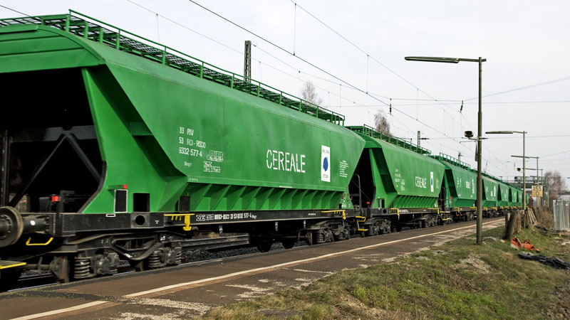 | Der hintere Zugteil bestand aus "neuen" rumänischen Cerealienwagen der Firma Rolling Stock. Ashausen, 24. März 2010 |