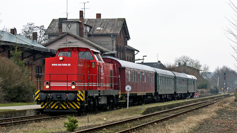 | Der Sonderzug der Salzwedeler Eisenbahnfreunde mit der Diesellok (die 52er ist ausgefallen) 293 005-5. Uelzen, 27. März 2010 |