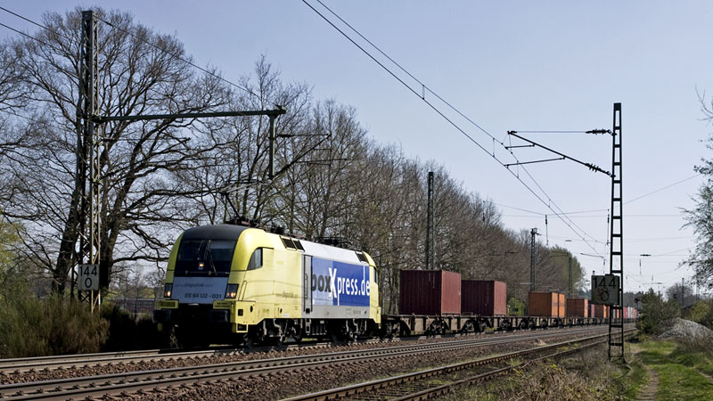 | Mit einem boxXpress.de-Containerzug eilte ES 64 U2-031 nach Hamburg. Radbruch, 18. April 2010 |