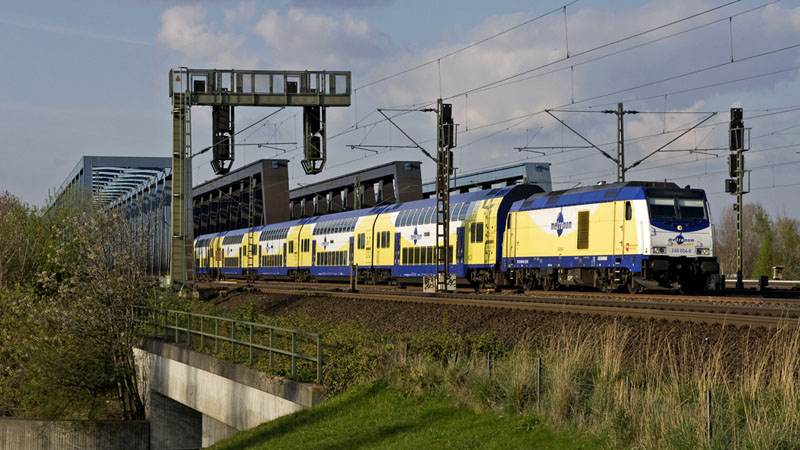 | Der stündliche metronom nach Bremen mit der ME 146-03. Hamburg Süderelbbrücken, 23. April 2010 |