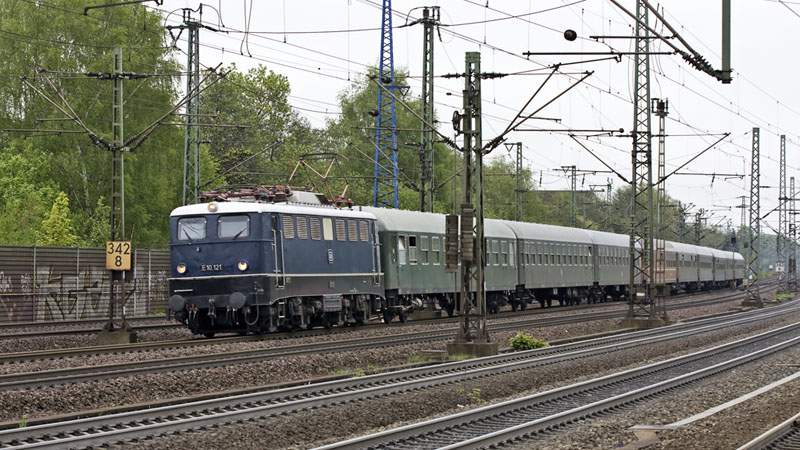 | Von Köln kam dieser klassische "D-Zug" der 60er Jahre mit der blauen E 10 121! Hamburg-Harburg, 8. Mai 2010 |