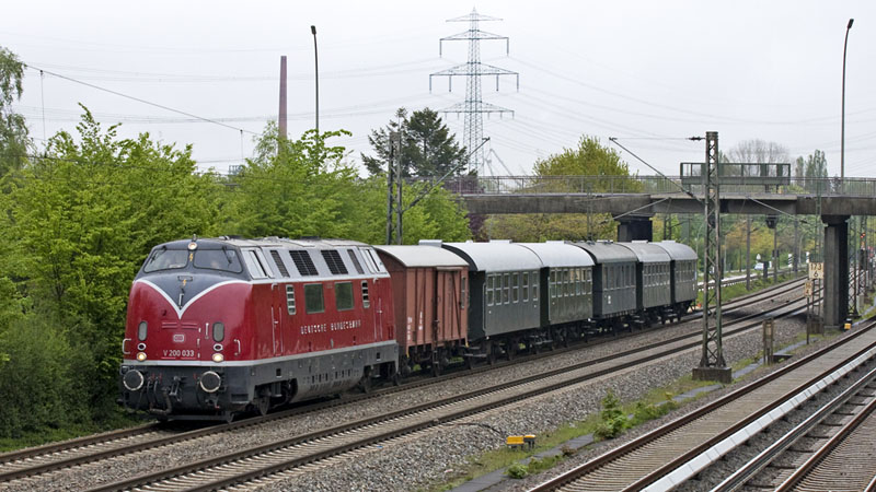 | Die schöne V200 033 der Hammer Eisenbahnfreunde auf großer Tour nach Stade… Hamburg-Hausbruch, 8. Mai 2010 |