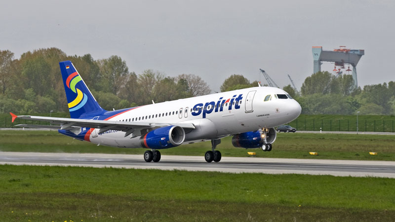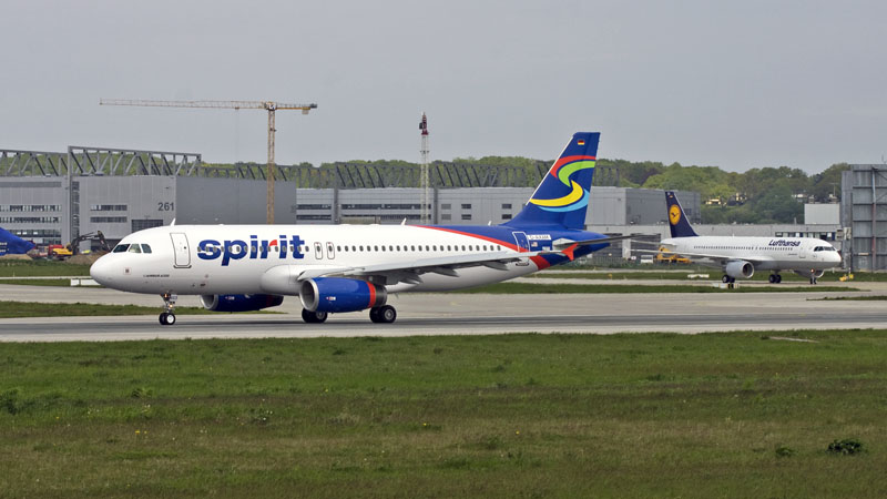 | Die A320 der amerikanischen spiritair passierte dabei die testende A320 der Lufthansa. Hamburg-Finkenwerder, 19. Mai 2010 |