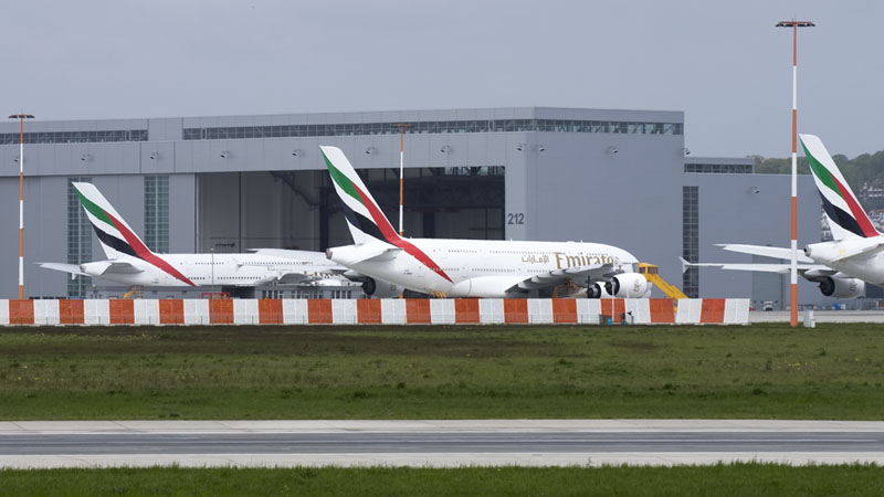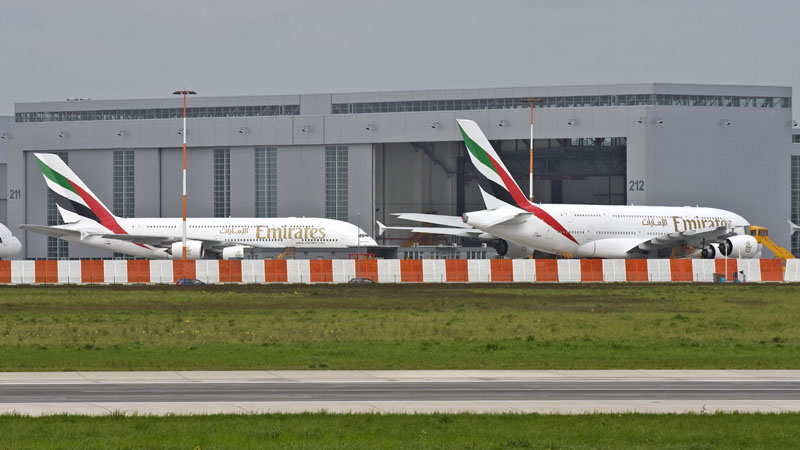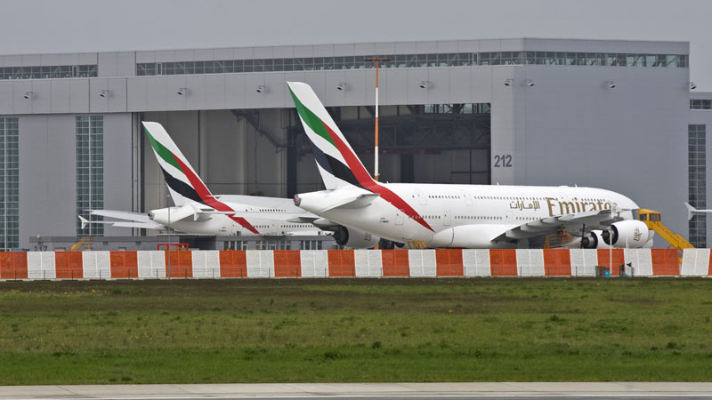 | Und nun waren gleich drei A380 der Emirates zu sehen – kein Wunder, die haben auch 58 Maschinen bestellt! Hamburg-Finkenwerder, 19. Mai 2010 |