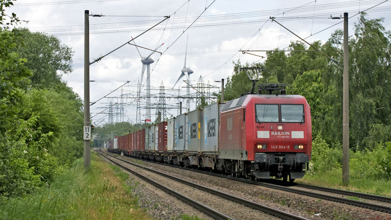| Auch die 145 004-8 hatte einen langen Containerzug aus dem Hafen zu bringen. Hamburg-Moorburg, 12. Juni 2010 |