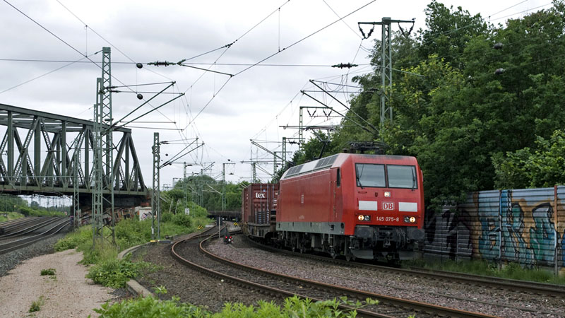 | Einfahrt frei für den Güterzug mit der 145 075-8 in den Hafenrangierbahnhof Hamburg-Süd. Hamburg-Veddel, 18. Juni 2010 |