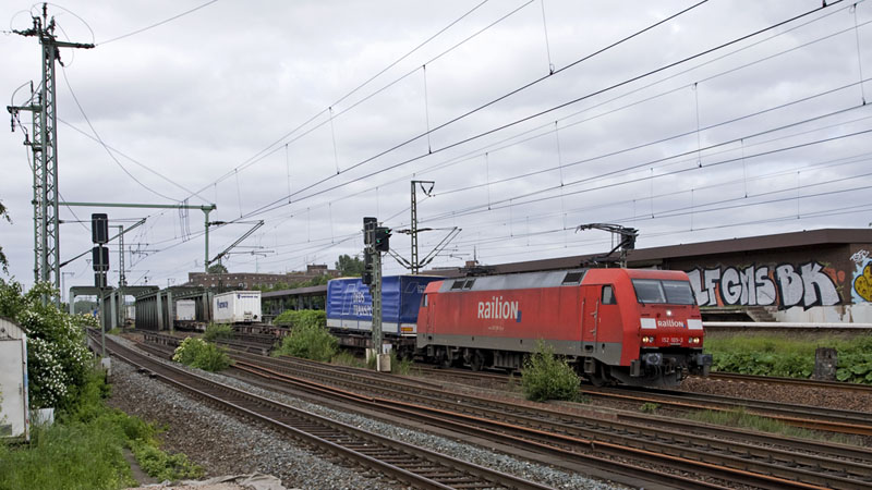 | Einen Zug des kombinierten Ladungsverkehrs brachte die 152 105-3 südwärts. Hamburg-Veddel, 18. Juni 2010 |