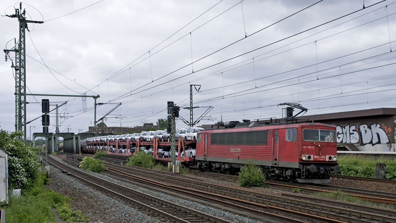 | Die sechsachsige 155 087-0 rollte mit ihrem gemischten Güterzug in Richtung Maschen. Hamburg-Veddel, 18. Juni 2010 |