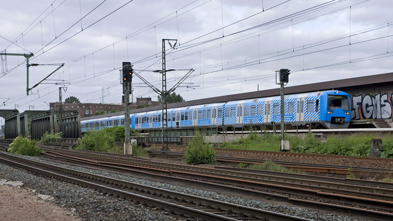 | Wie gehabt drehten die blauen IBA-S-Bahnen ihre Runden auf der S3… Hamburg-Veddel, 18. Juni 2010 |