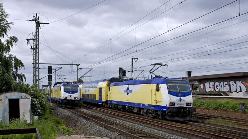 | Ein "metronom-showdown" mit 146 533-5 mit MEr nach Tostedt und die ME 146-02 mit ME zum Hbf. Hamburg-Veddel, 18. Juni 2010 |