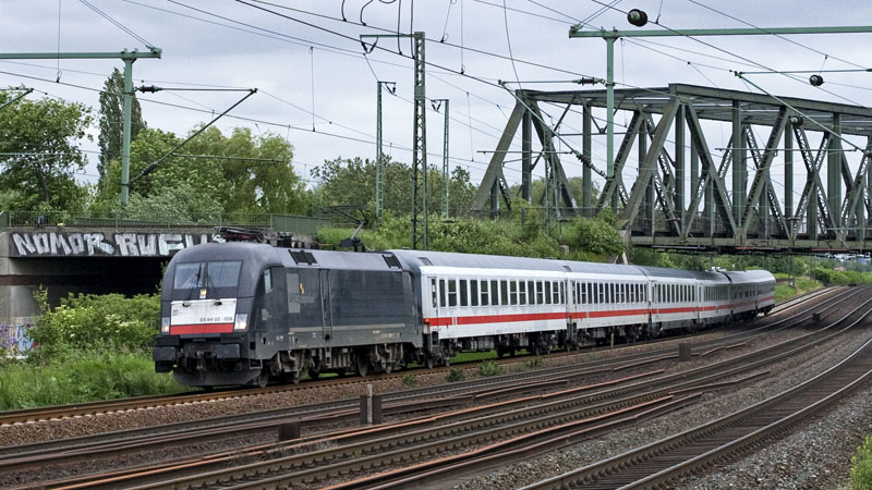 | Mit dem InterCity 2173 rauschte die MRCEdispolok ES 64 U2-030 in den Süden. Hamburg-Veddel, 18. Juni 2010 |