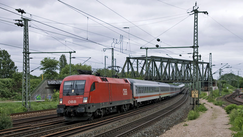 | Der Nord-Südstrecken-IC 2082 "Königssee" mit der ÖBB 1116 176-7. Hamburg-Veddel, 18. Juni 2010 |