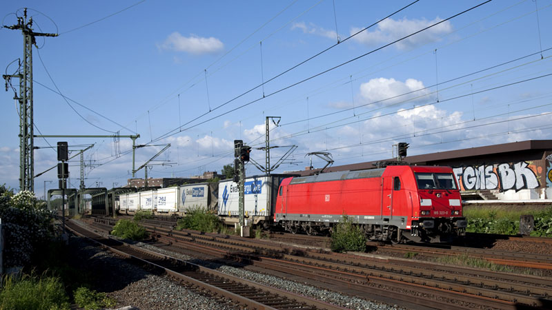 | Ohne Unterstützung der Wagenlok 185 405-5 wuppte die EG 3103 ganz alleine diesen schweren Güterzug nach Schweden. Hamburg-Veddel, 25. Juni 2010 |