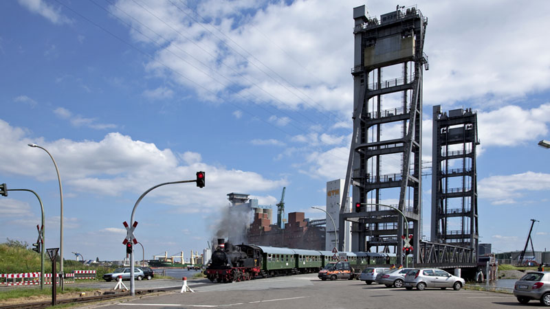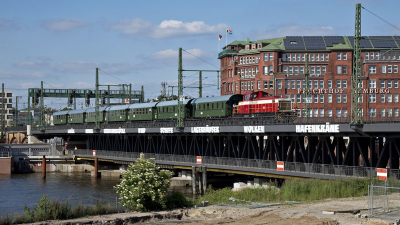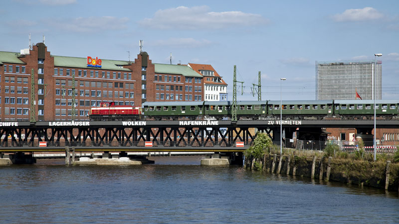 | Der Sonderzug überquerte auch die altehrwürdige Rethe-Hubbrücke, die bald ersetzt werden soll. Hamburg-Hohe Schaar, 26. Juni 2010 |