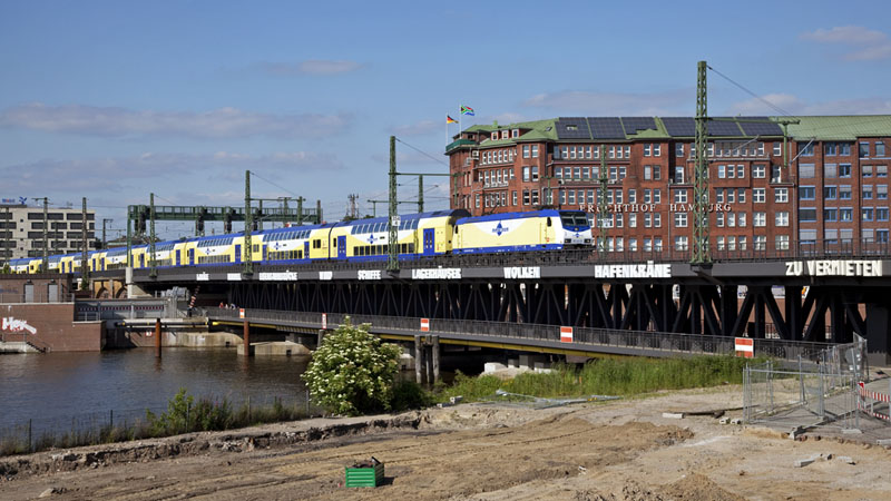 | Ein ausfahrender metronom nach Bremen mit der ME 146-05. Hamburg-Oberhafen, 26. Juni 2010 |