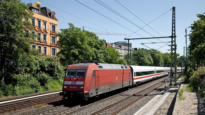 | Der ICE-Ersatzzug als ICE 1106 mit 101 124-6 und MET-Wagen und am Ende 101 131-1. Hamburg-Sternschanze, 27. Juni 2010 |