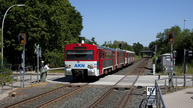 | Eine einfahrende A1 nach Hamburg-Eidelstedt mit VT2E 45 und VTA 61 passierte diesen BÜ. Hamburg-Eidelstedt | Hörgensweg, 27. Juni 2010 |