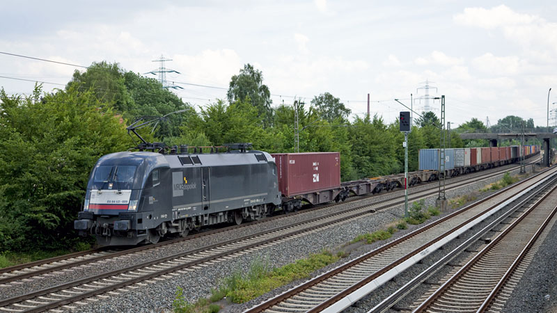 | Im Blockabstand folgte die schwarze ES 64 U2-009 von boxXpress.de mit weiteren Seekisten. Hamburg-Hausbruch, 15. Juli 2010 |