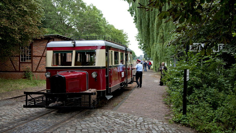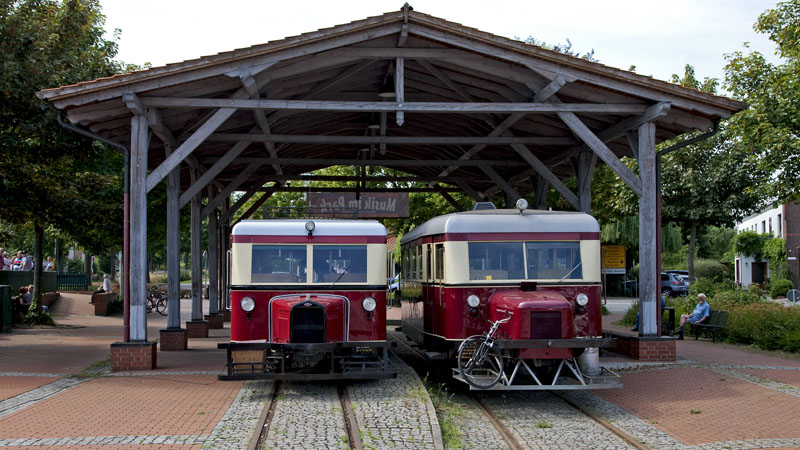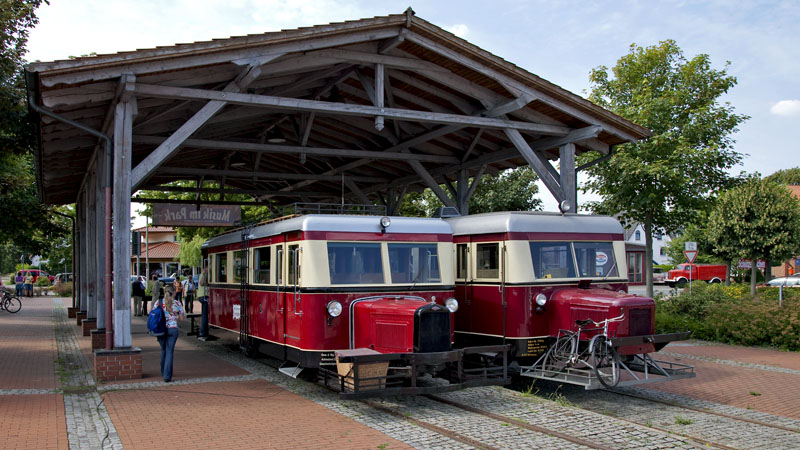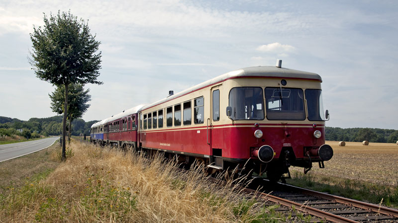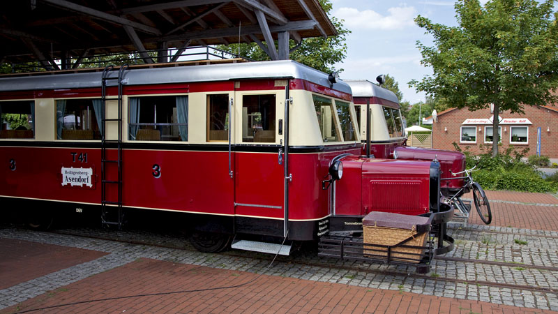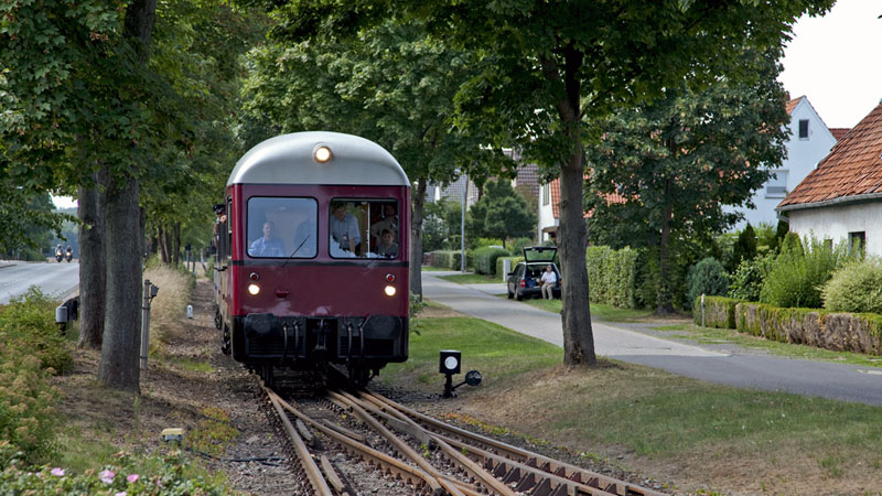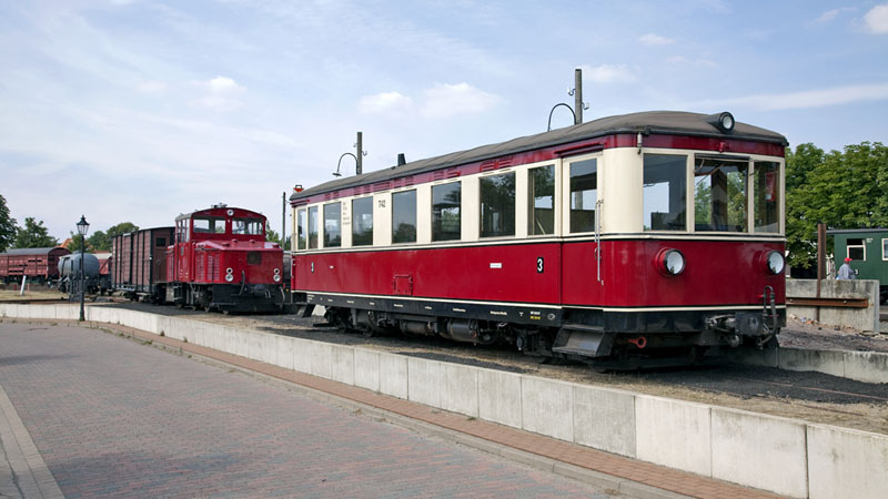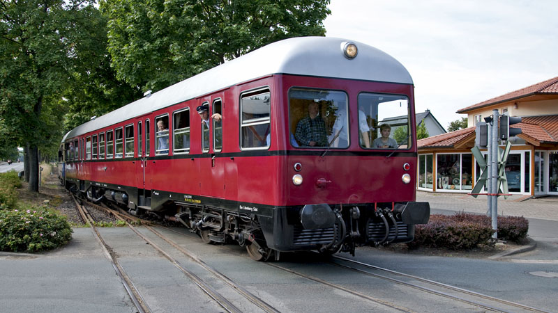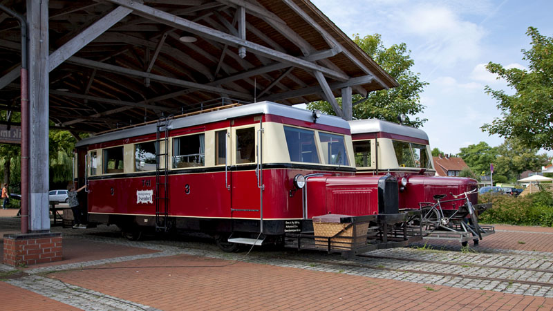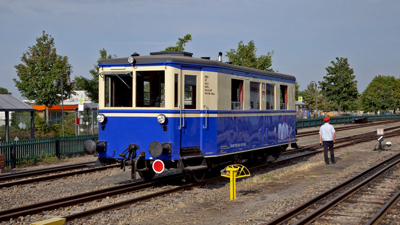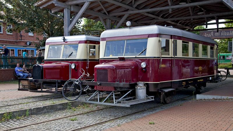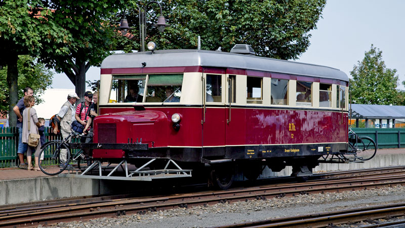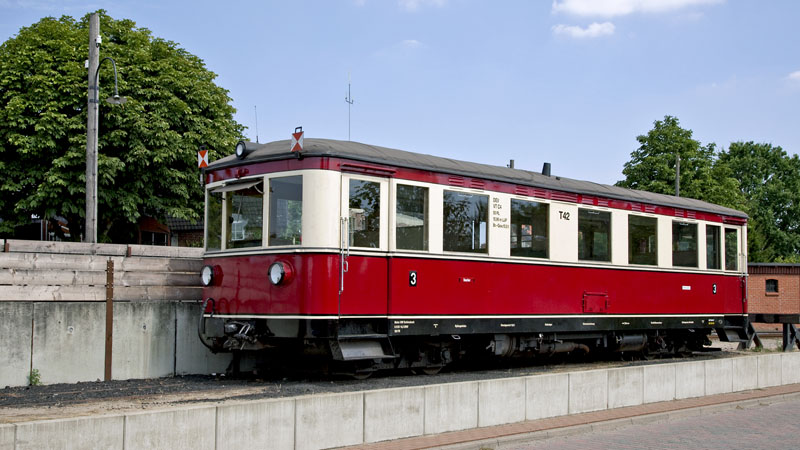| Der wunderschön aufgearbeitet Triebwagen T42 der DEV – 1939 von der Dessauer Waggonfabrik an die Franzburger Kreisbahnen geliefert. Bruchhausen-Vilsen, 7. August 2010 | ||