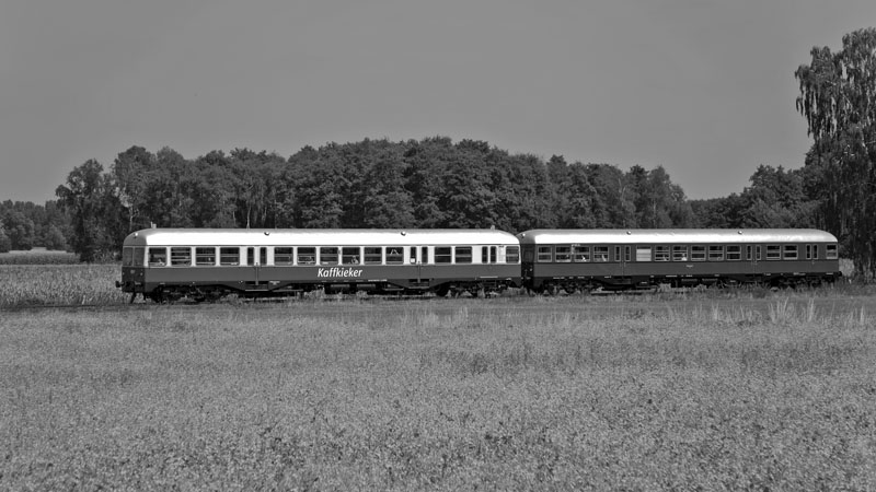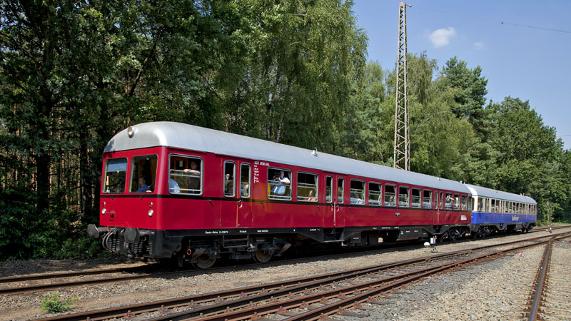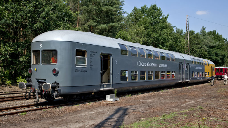| Mit den beiden VOITH-Loks kam dieses Schmuckstück der ehemaligen Lübeck-Büchener-Eisenbahn, der Doppelstöcker! Vor 75 Jahren (!) fuhren solche Waggons mit den stromlinienförmigen "Micky-Maus-Tenderloks" im schnellen H-L-Schnellverkehr – deren Fahrzeiten sind heute noch unschlagbar. Eystrup, 7. August 2010 | ||