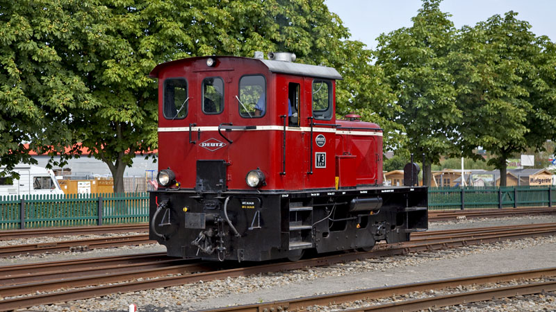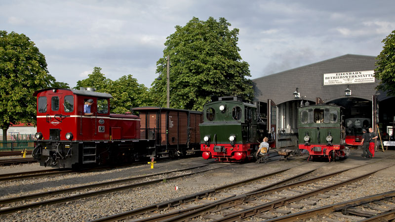 | Vor dem Schuppen waren die Mannen dabei, ihre Züge und Loks zu warten und umzurangieren – links die DEUTZ-Lok V3. Bruchhausen-Vilsen, 7. August 2010 |