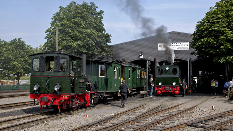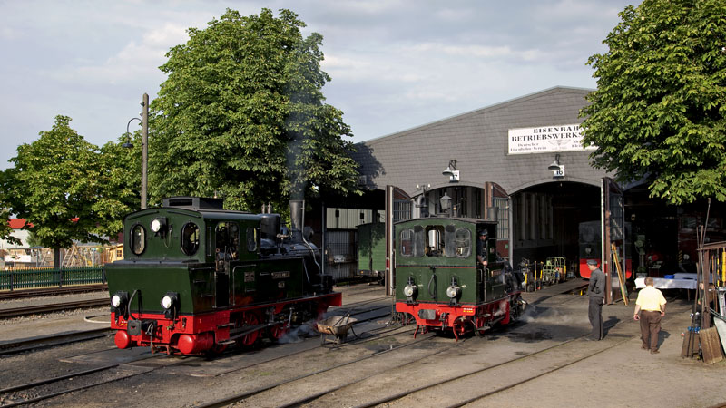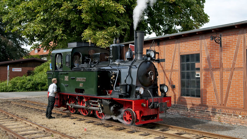 | Vor dem Lokschuppen der DEV standen die Loks "Franzburg" und "Spreewald" – letztere machte ordentlich Dampf. Bruchhausen-Vilsen, 7. August 2010 |