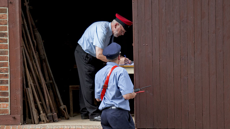 | Der Stationsvorsteher und der Zugführer des "GmP 430" führten Dienstgespräche – auch das gehört zu einem geregelten und sicheren Museumsbahnbetrieb. Heiligenberg, 7. August 2010 | ||