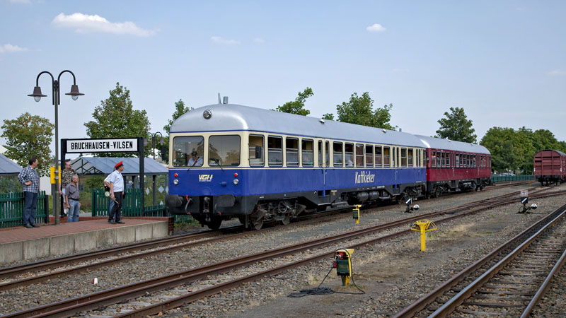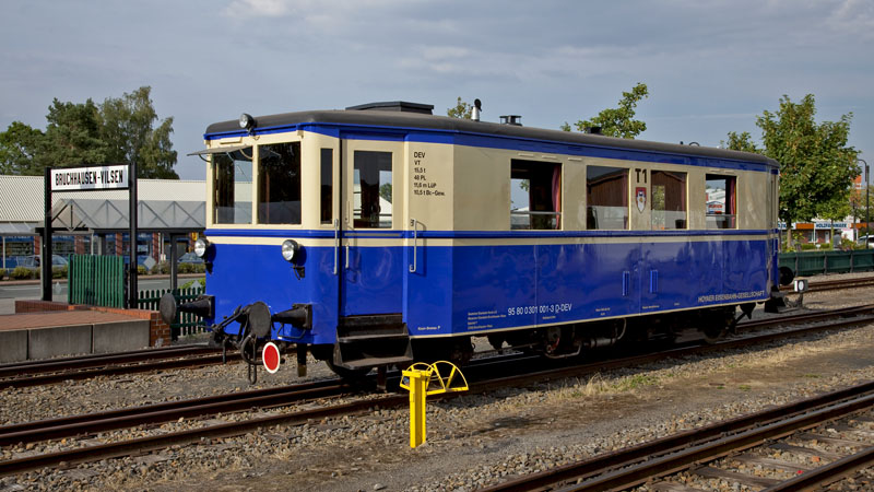 | Der historische Triebwagen T1 der DEV – gebaut 1936 vom Gothaer Waggonfabrik für die Hoyaer Eisenb. Gesellschaft. Bruchhausen-Vilsen, 7. August 2010 |