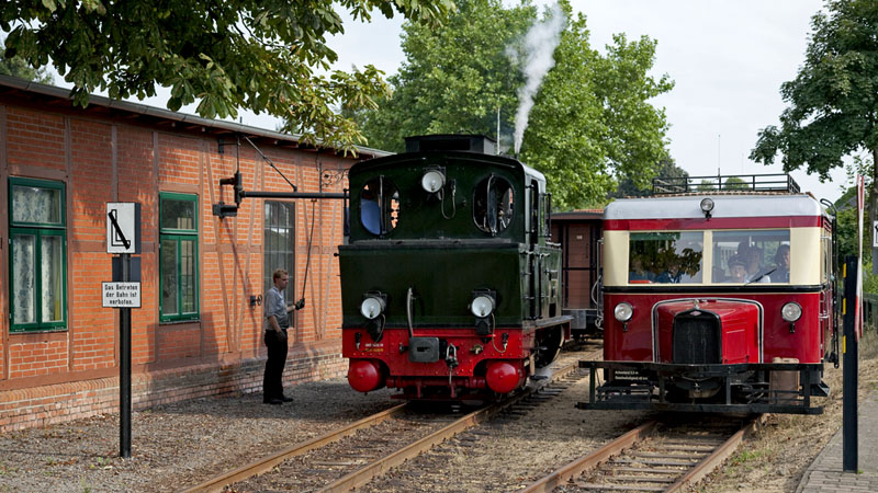 | An der Rollbockgrube, der Schnittstelle zwischen Normal- und Schmalspur, wartete die Tramwaylok "Plettenberg". Bruchhausen-Vilsen, 7. August 2010 |