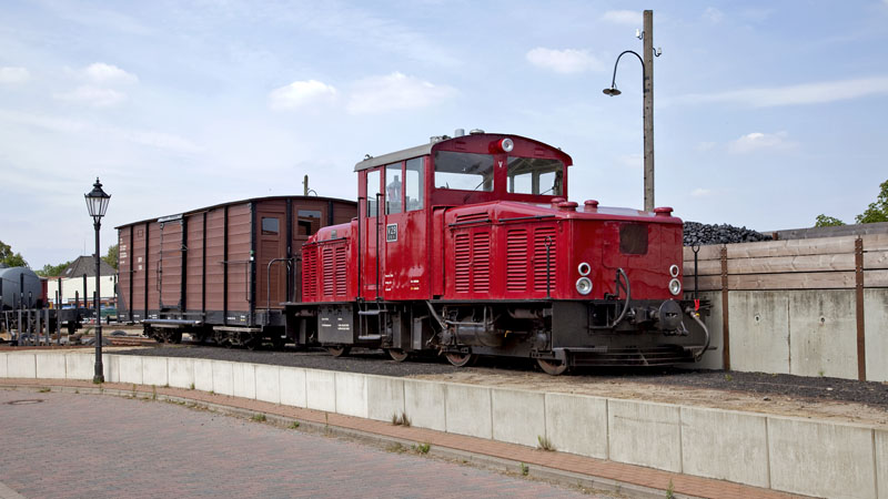 | Diese schöne DEUTZ-Diesellok V 3 wieselte unermüdlich im Bahnhofsbereich umher – 1954 an die Euskirchener Kreisbahnen, dann zur VGH – wo sie bis heute geblieben ist. Bruchhausen-Vilsen, 7. August 2010 | ||