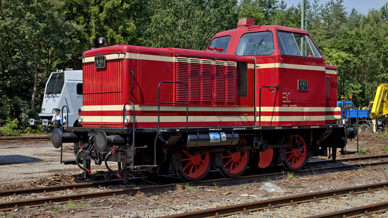 | Die Diesellok V29, 1952 von JUNG als V 29 952 an die Bundesbahn geliefert und gelang über die Mittelbadische Eisenbahn, Südwestdeutsche Eisenbahn und die DGEG zur DEV. Bruchhausen-Vilsen, 7. August 2010 | ||