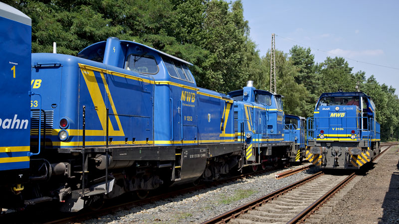 | Im schicken blauen MWB-Look waren z.B. die V 1253 (ex DB 212 285-1 – gebaut 1965 bei MaK in Kiel) und rechts die moderne MaK G1206 alias V 2105 (Baujahr: 2004). Eystrup, 7. August 2010 | ||