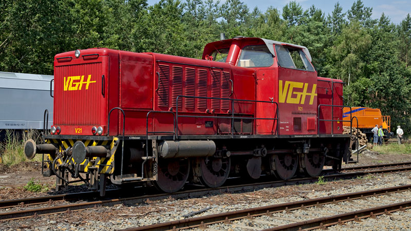 | Die V21 der Verkehrsbetriebe Grafschaft Hoya GmbH – eine MaK 650 D (1959 an die OHE als 60021). Eystrup, 7. August 2010 |