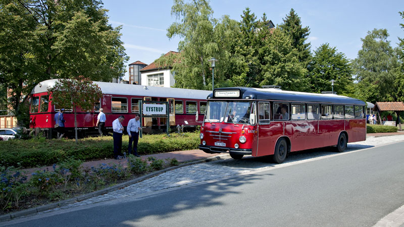 | Eine nette Szene ergab sich, als der Hamburger Museumsbus 6406 der VHH neben den beiden GDT's stand. Eystrup, 7. August 2010 |