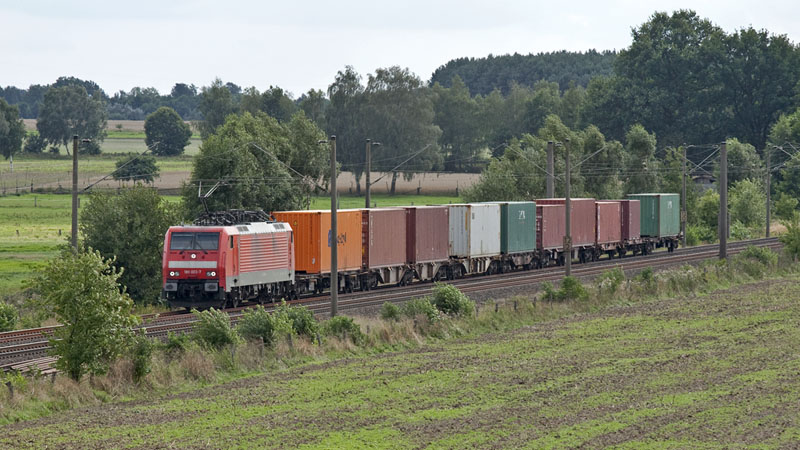 | Auch die ehemalige HGK-Lok 145-CL 013 fährt nun für die OHE – hier mit einem Containerzug nach Hamburg. Ramelsloh, 21. August 2010 |