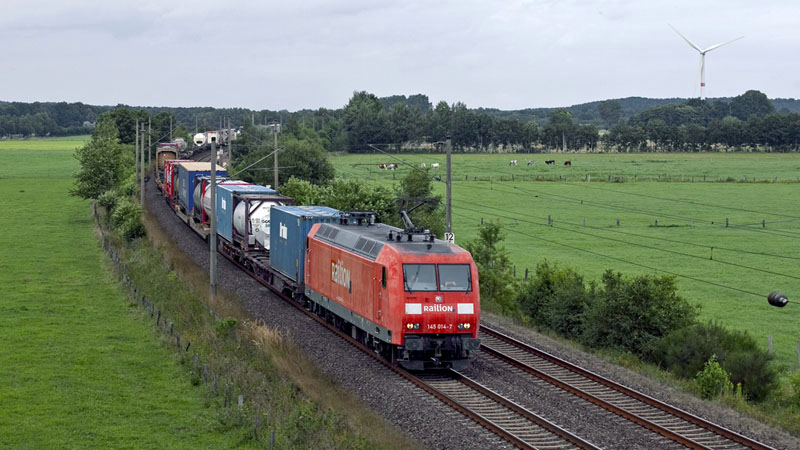 | Fast nur aus Tankcontainern bestand dieser mit der 145 014-7 bespannte Zug. Ramelsloh, 22. August 2010 |