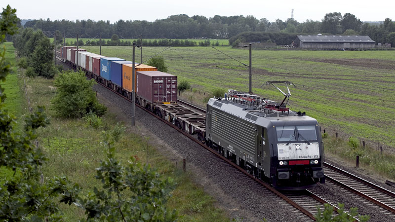 | Die schwarze ES 64 F4-113 von MRCEdispolok zog diesen kurzen Containerzug nach Hamburg. Ramelsloh, 22. August 2010 |