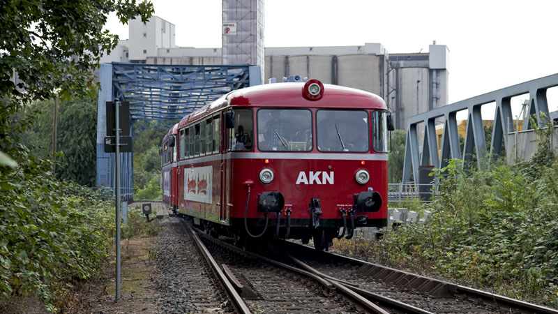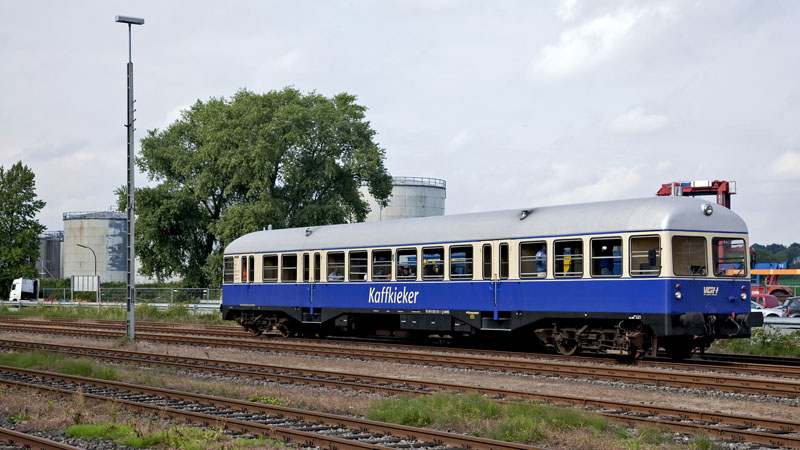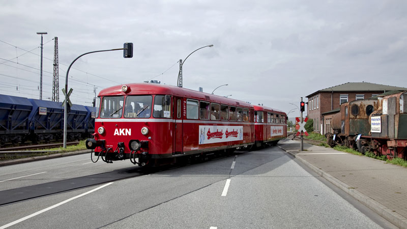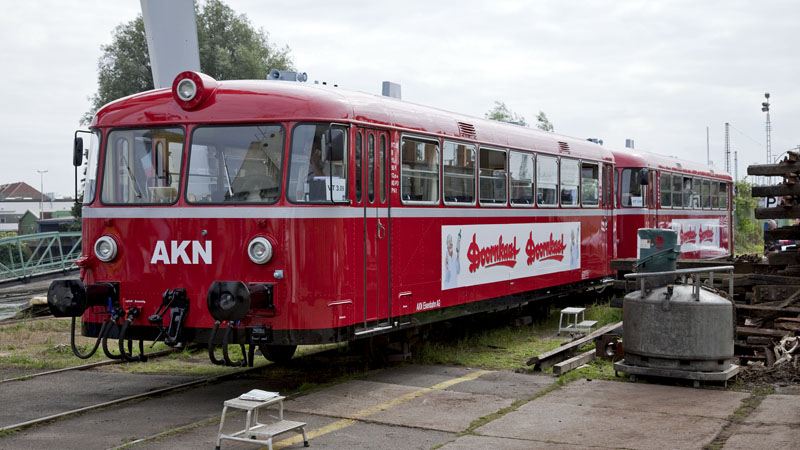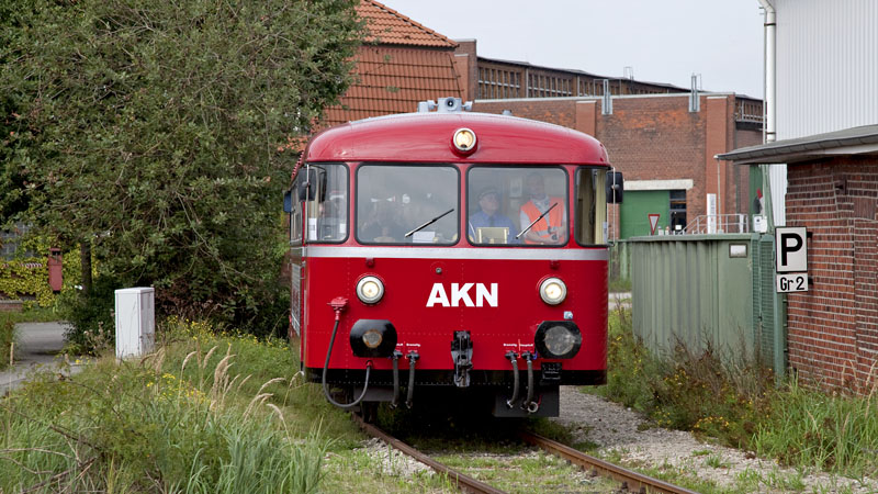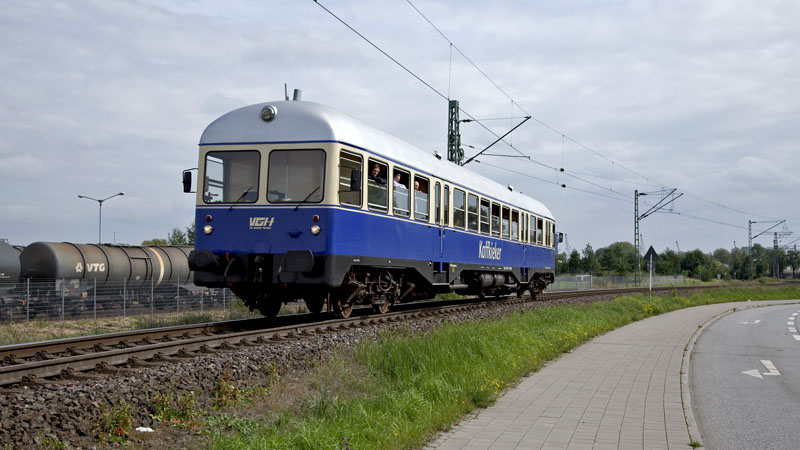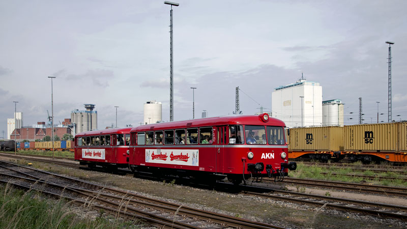 | Auf Hafenrundfahrt war diese schöne Schienenbusgarnitur der AKN – die Teilnehmer besuchten grad das Hafenmuseum. RBF Hamburg-Süd, Schuppen 50, 11. September 2010 |