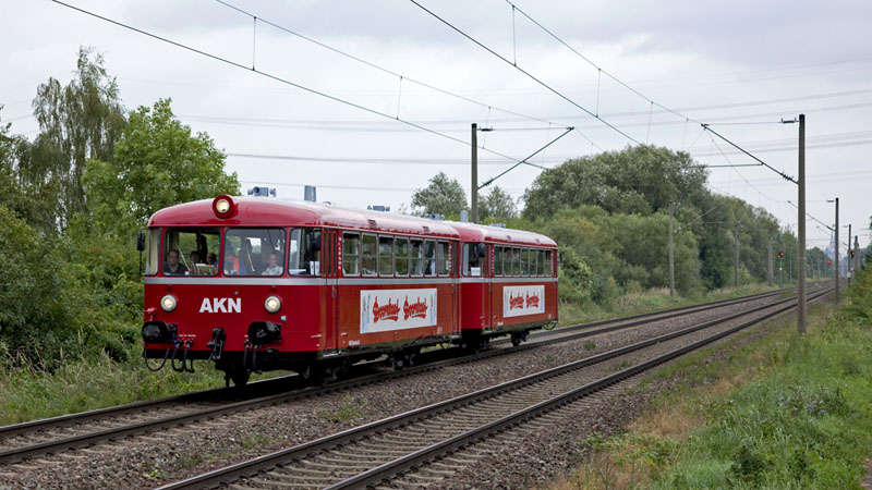 | Die beiden schönen Schienenbusse der AKN mit der historischen "Doornkaat"-Werbung. Hamburg-Moorburg, 11. September 2010 |