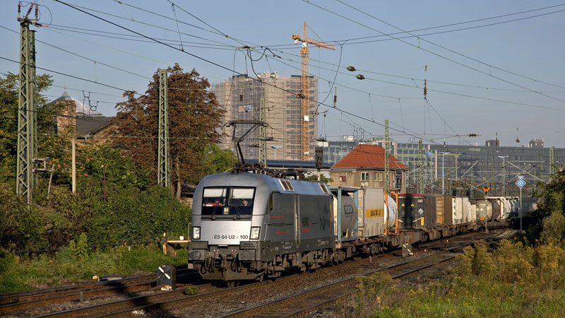 | Der dritte Kracher am frühen Morgen: der HUPAC-Taurus! Die ES 64 U2-100 mit dem KLV-Zug von Ruhland nach Buna. Halle (Saale), 23. September 2010 |