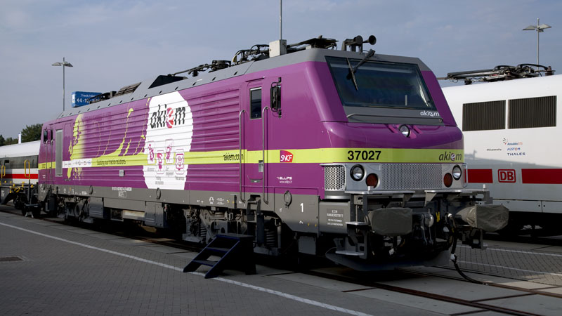 | Die PRIMA-Ellok 37027 des Vermieters akiem in dem außergewöhnlichen Lila-Look. Berlin InnoTrans 2010, 24. September 2010 |