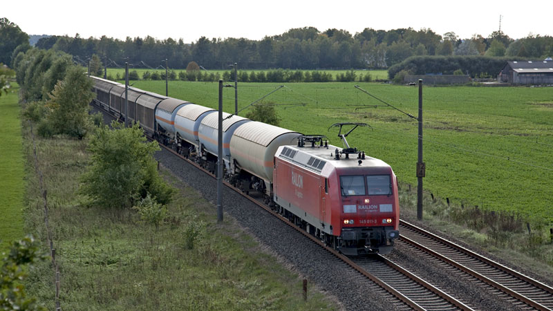 | Die 145 011-3 mit einem gemischten Güterzug nach Maschen. Ramelsloh, 30. September 2010 |