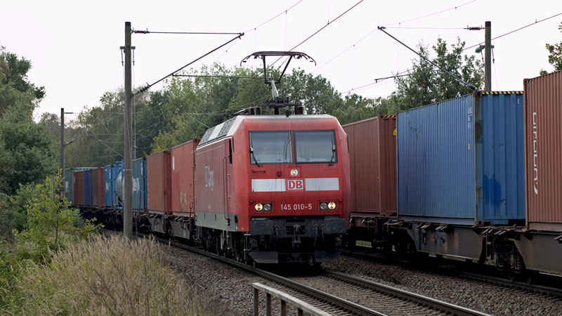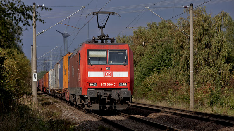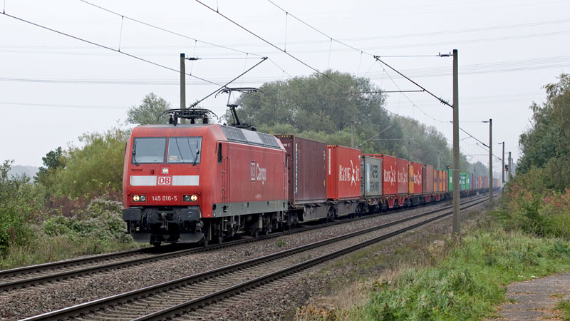 | Zum Schluß kam noch die Sonne heraus, als die "Pendlerin" 145 010-5 mit Containern nach Maschen fuhr. Hamburg-Moorburg, 12. Oktober 2010 |