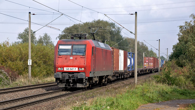 | Die noch im Railion-Schema fahrende 145 047-7 mit weiteren Seekisten. Hamburg-Moorburg, 12. Oktober 2010 |