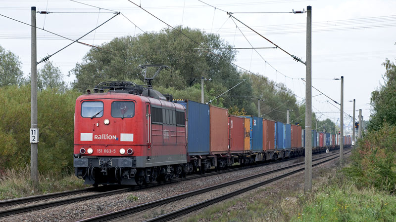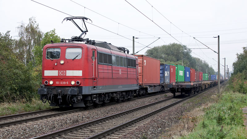 | Noch mehr Seekisten aus dem Hafen hatte die 151 063-5 am Haken. Hamburg-Moorburg, 12. Oktober 2010 |