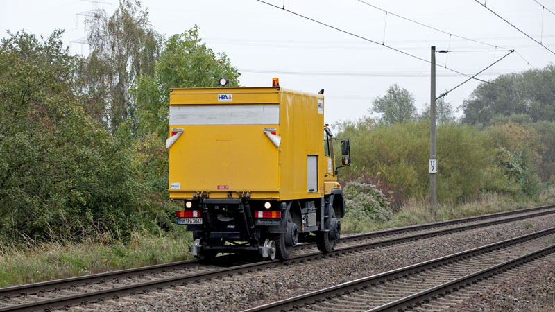 | Ein Zweiwege-Unimog der Hamburg Porth Authority (HPA) im Rückwärtsgang. Hamburg-Moorburg, 12. Oktober 2010 |